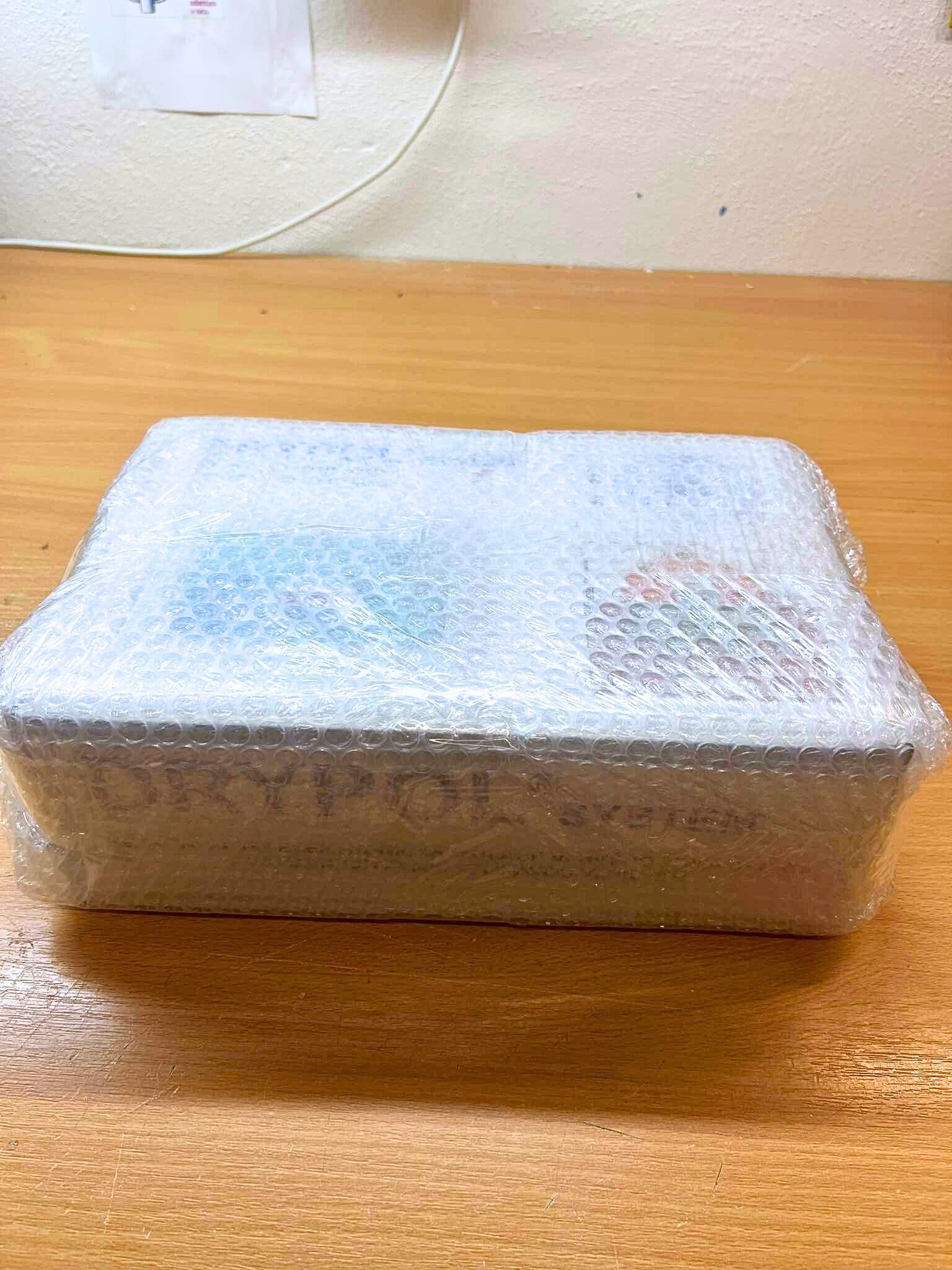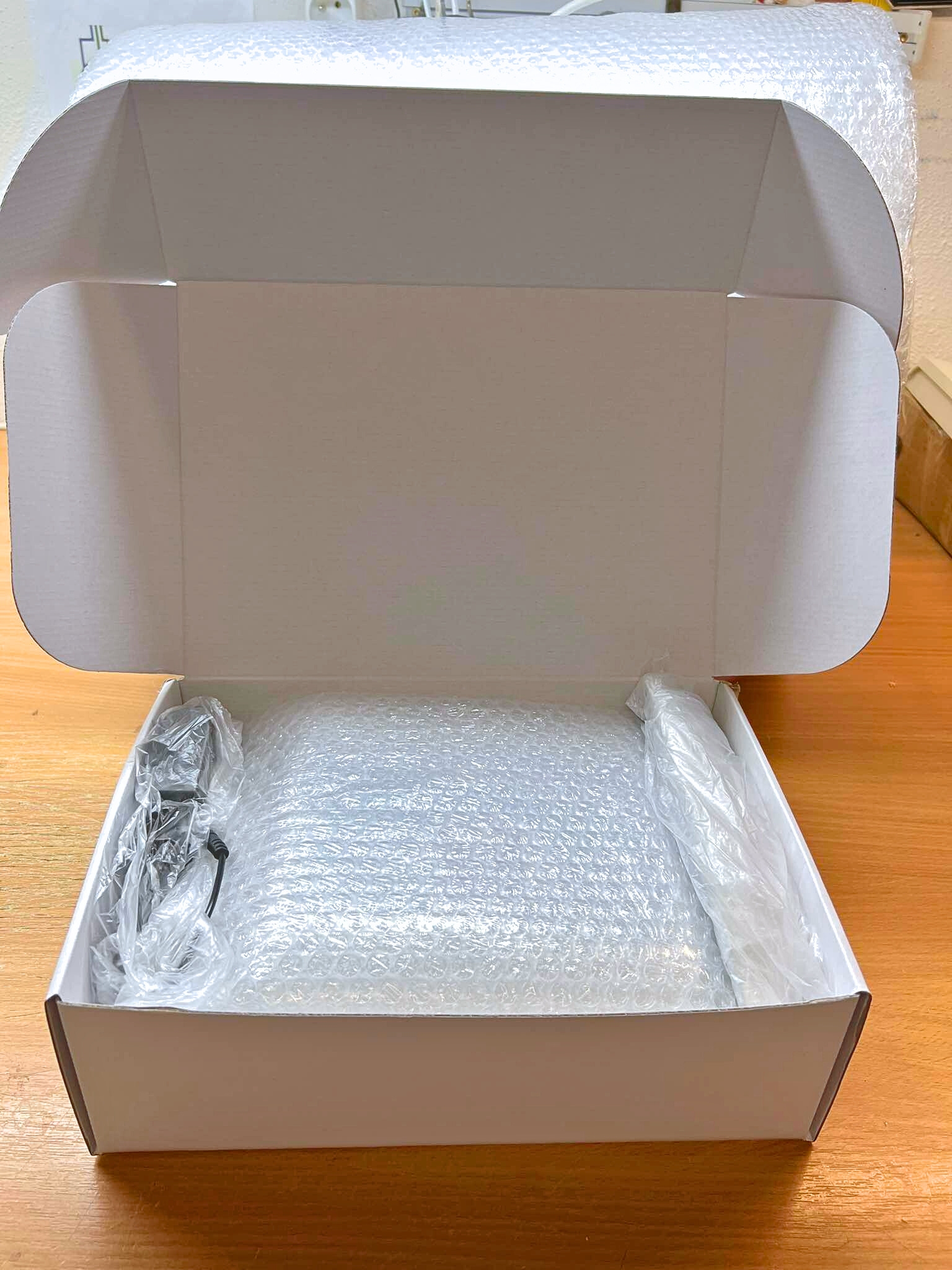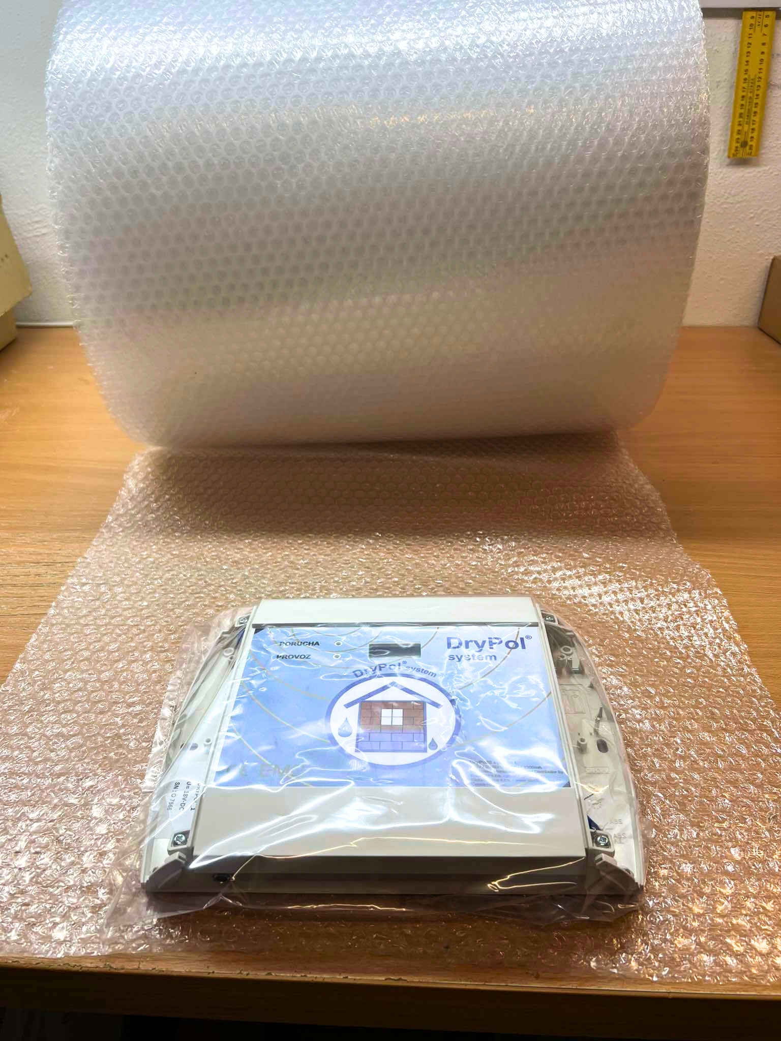 Na samém začátku zabalíme nejprve přístroj na odstranění vlhkosti Drypol® do bublinkové fólie, aby se v krabici co nejméně hýbal (a když už, aby měl dostatečný polštář, který by ztlumil jakékoliv nárazy).