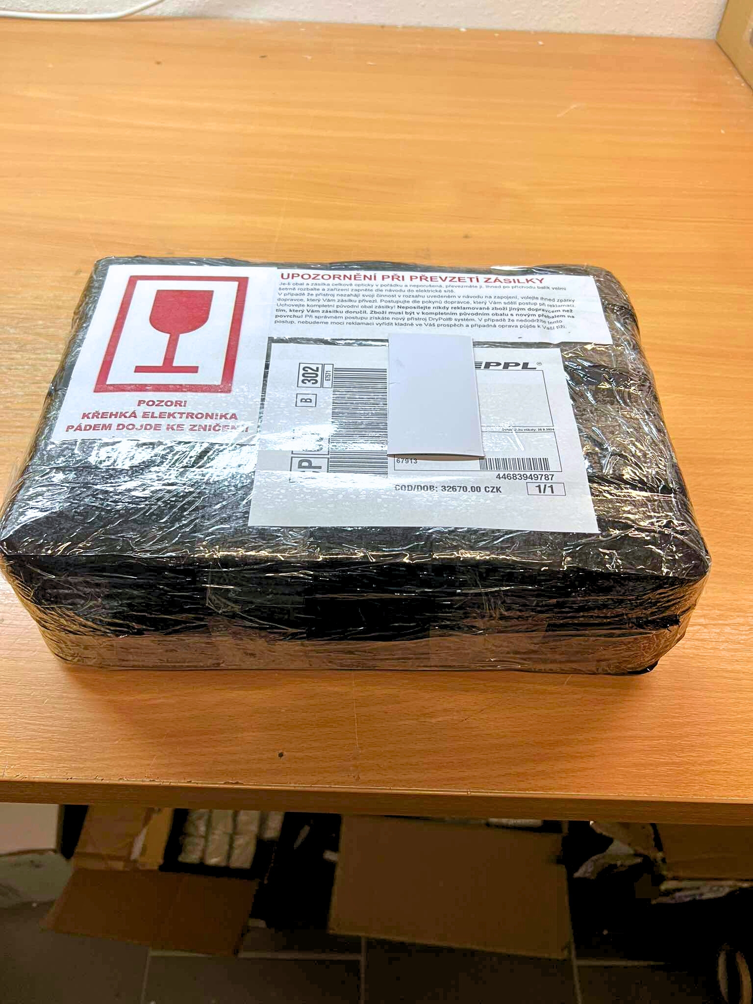 Před odesláním však zásilku ještě obalíme v černé a průhledné fólii, aby balík zůstal po celou dobu kompaktní, a navíc doplníme upozornění, že obsahem je křehká elektronika