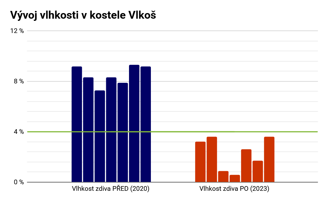 Vzlínající vlhkost se nevyhnula ani kostelu Nanebevzetí Panny Marie v obci Vlkoš. Samozřejmě jsme nechtěli přistoupit ke stavebním úpravám objektu a navrhli chytřejší řešení.